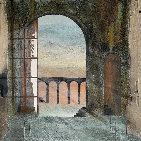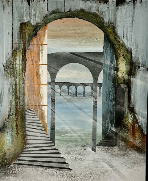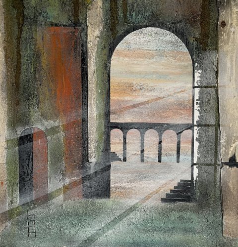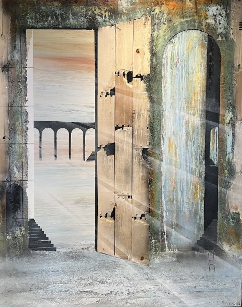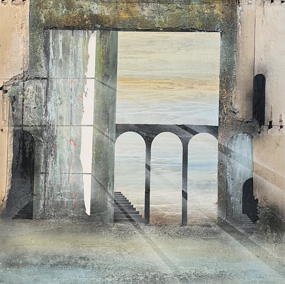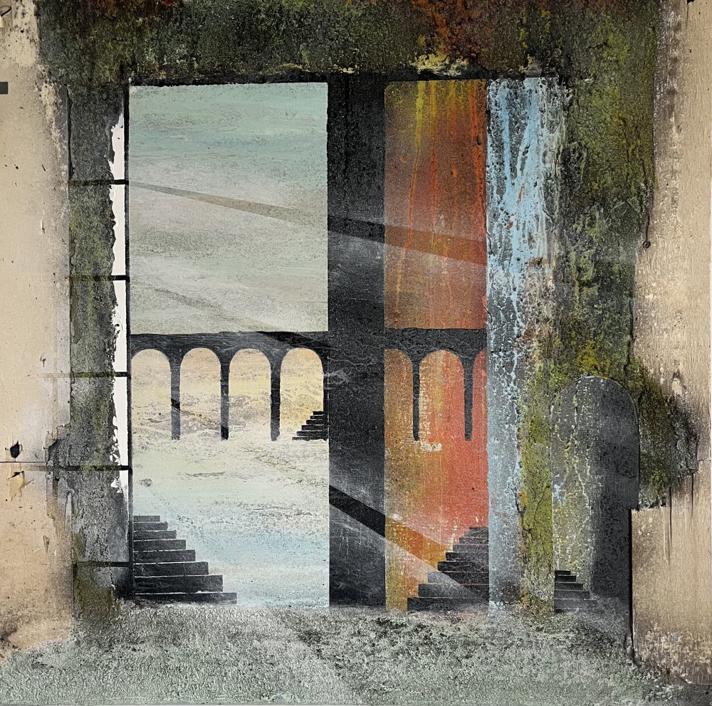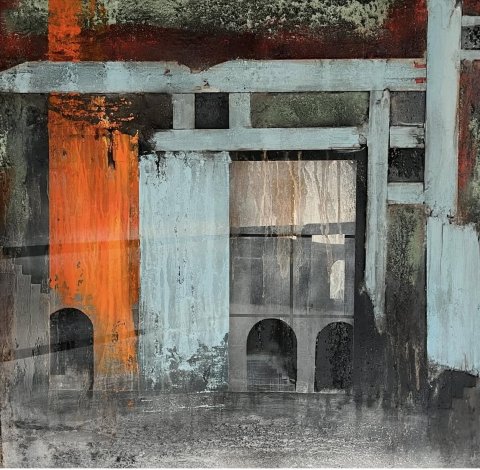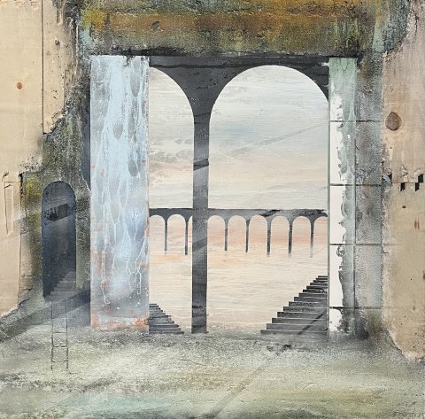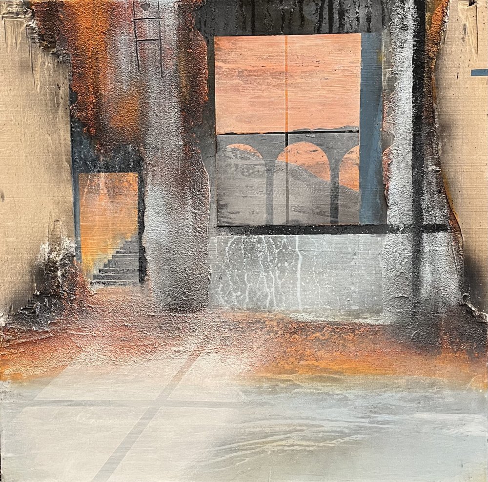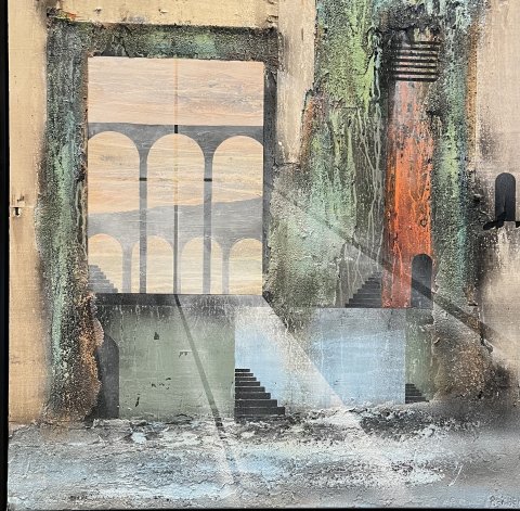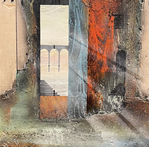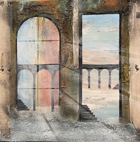 Imagine - 175x175 cm 22000 kr. |  Murebiens paradis 2025 90x90 cm 9500 kr. Kan ses i Galleri havn Kerteminde |  Smal opgang 60x60 cm. 2026 5500 kr. |