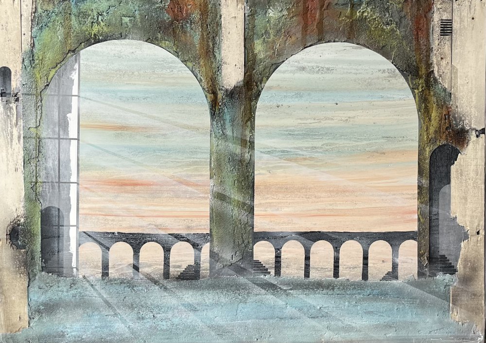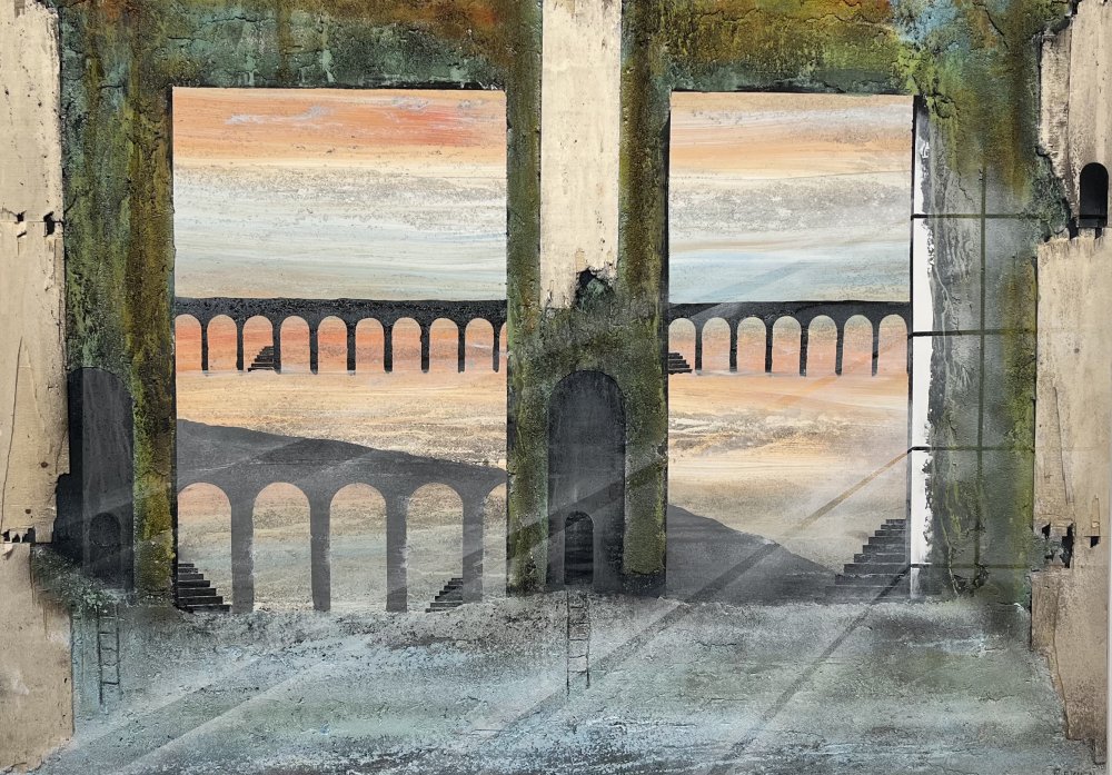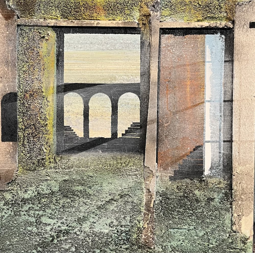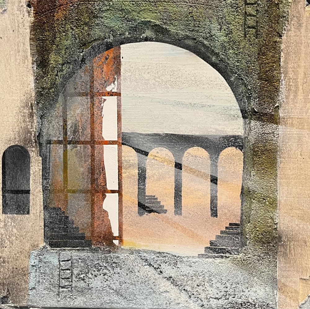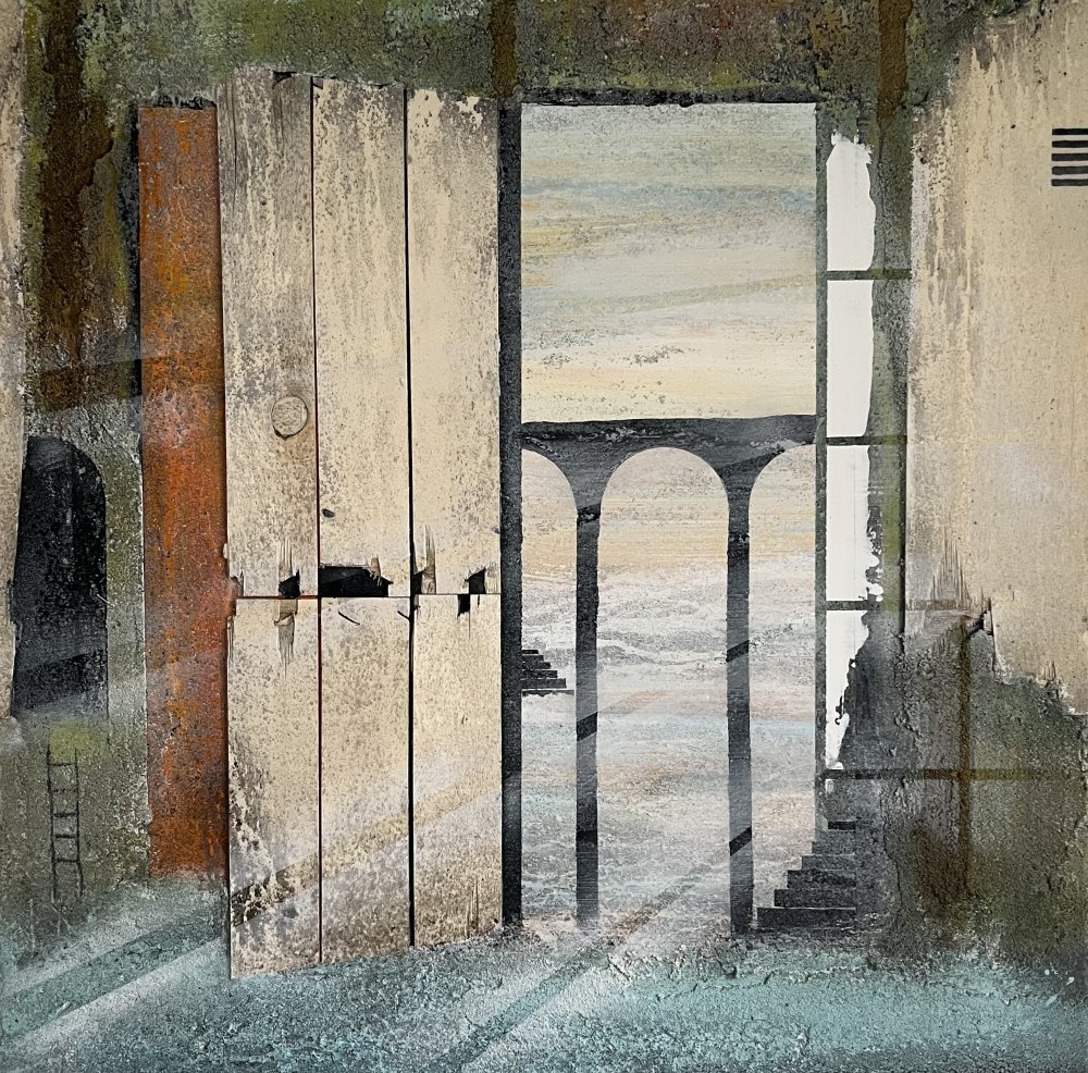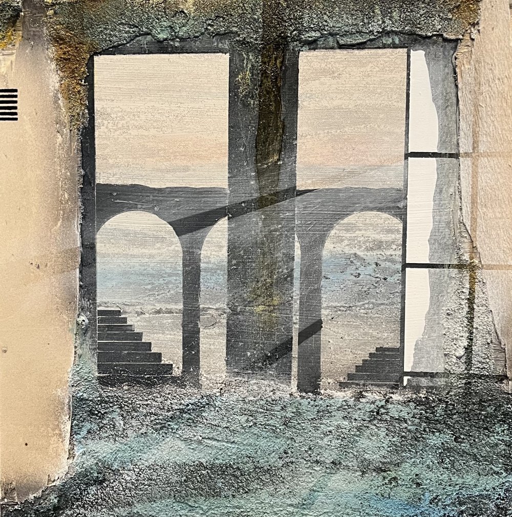 Imagine - 175x175 cm 22000 kr. |  Murebiens paradis 2025 90x90 cm 9500 kr. Kan ses i Galleri havn Kerteminde |  Smal opgang 60x60 cm. 2026 5500 kr. |